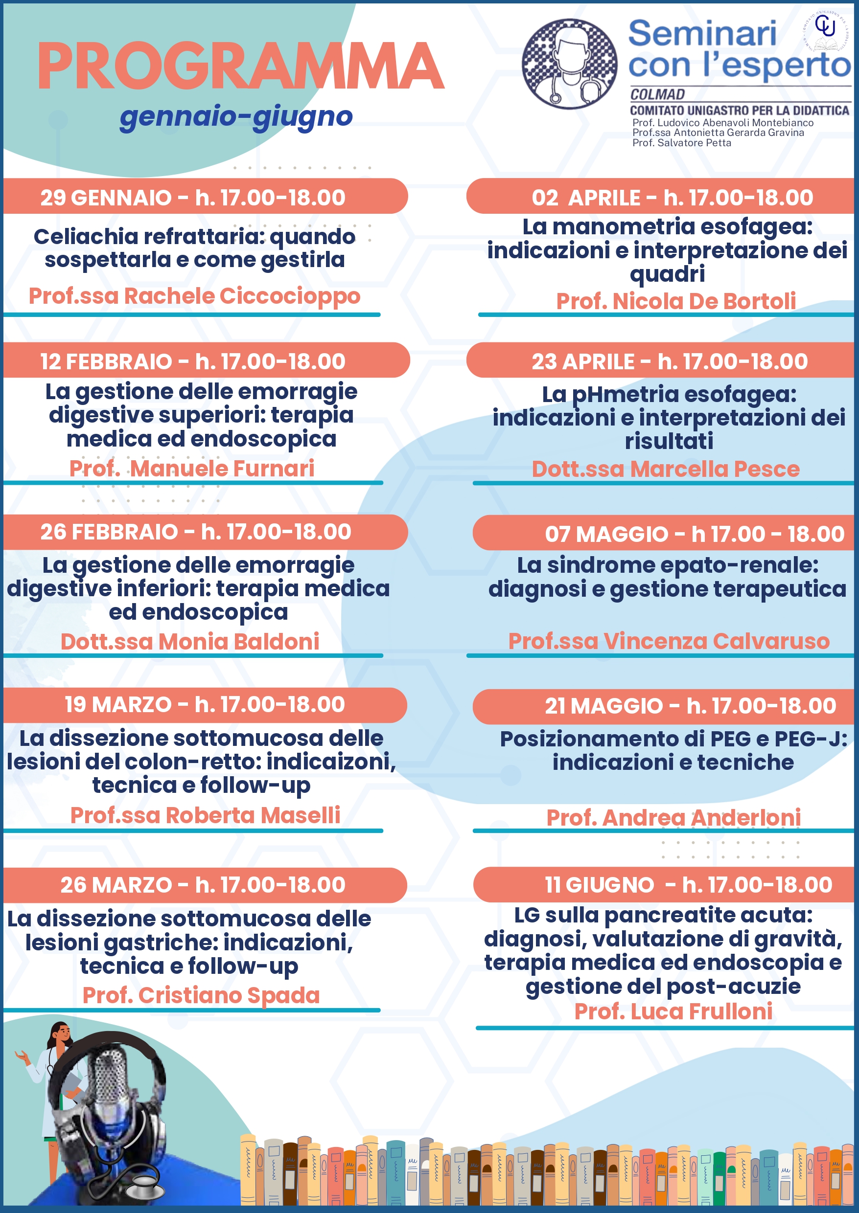 I Seminari con l’esperto sono lezioni frontali, dedicate a tutti i medici in formazione delle Scuole di Specializzazione in Malattie dell’Apparato Digerente. Vi aspettiamo in diretta, sulla piattaforma Google Meet, a giovedì alterni dalle ore 17.00 alle ore 18:00 circa, come da programma redatto dal Comitato UNIGASTRO per la didattica. Il link per partecipare viene inviato prima di ogni lezione a Direttori e Specializzandi dalla segreteria organizzativa: info@colmadunigastro.it